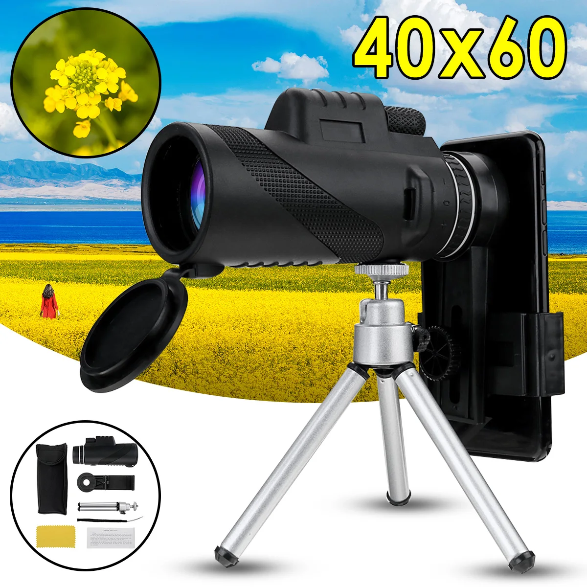 البحث عن معلوماتمعلومات اضافية BAK4 40X60 التكبير HD عدسة ناظور أحادي العين للرؤية الليلية تلسكوب + ترايبود الهاتف كليب مناظير ل في الهواء الطلق الصيد التخييم ل فون